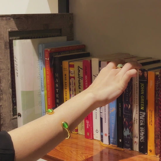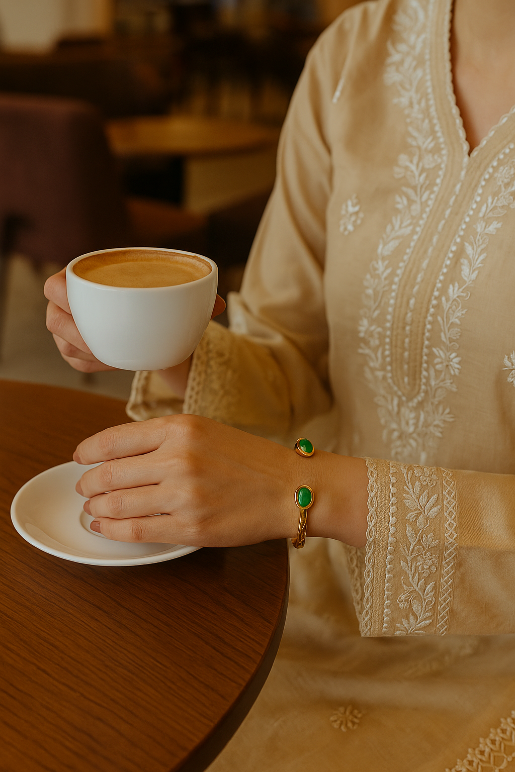 • Gold-plated open cuff featuring rich green jade stones — a symbol of tranquility and renewal